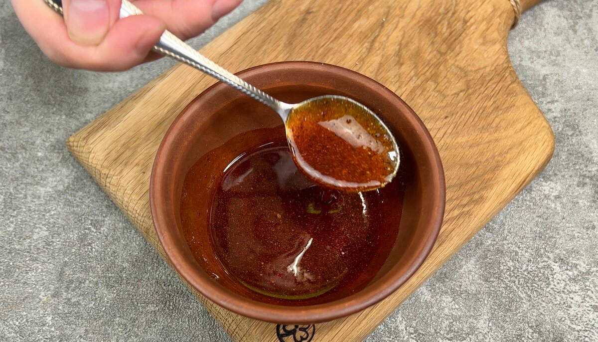 1. Для обмазки м’яса змішуємо оливкову олію, солодку паприку, сіль і чорний мелений перець.
