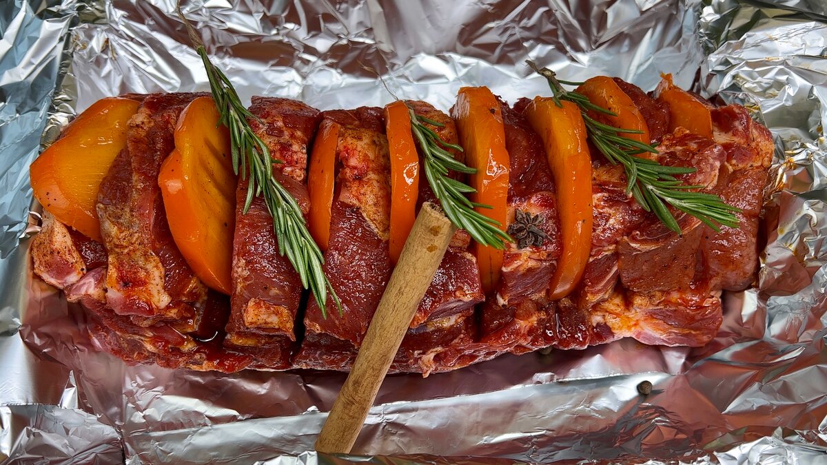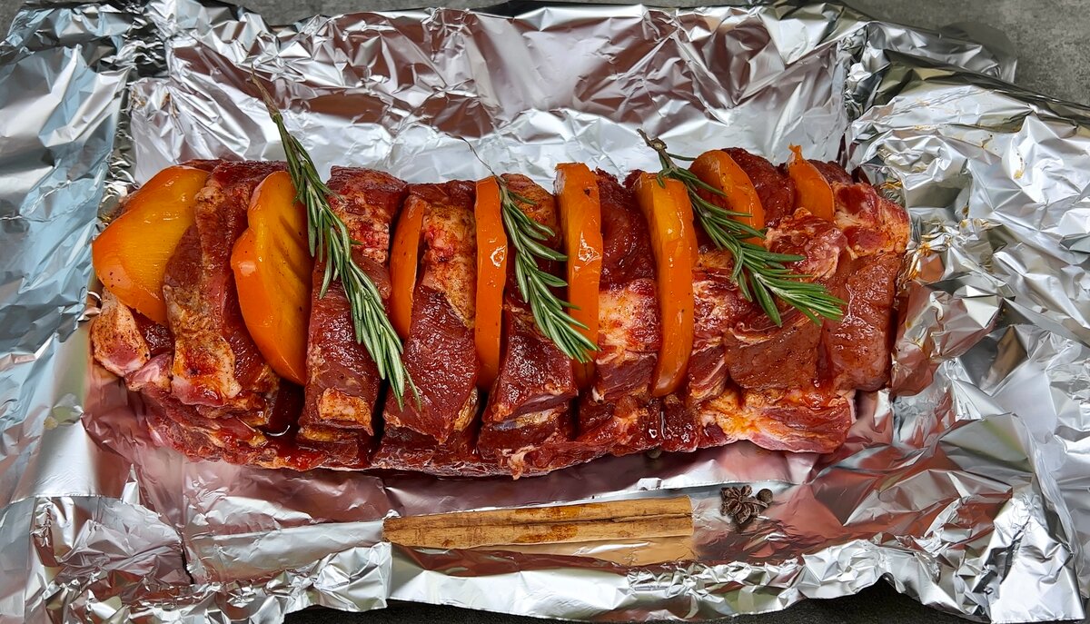 4. Щільно загортаємо м’ясо в фольгу і відправляємо запікатися в розігріту до 180 градусів духовку на 1 годину і 40 хвилин.