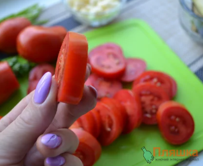 А ось помідорів у результаті я витратила – 800 грамів, (в оригінальнім рецепті 1 кілограм, думаю тому, що я їх взяла маленького розміру). Помідори нарізала кружальцями, посолила трохи.