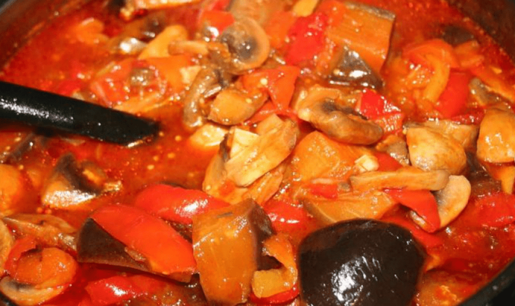 Потім додати болгарський перець, гриби, часник і варити 30 хвилин.