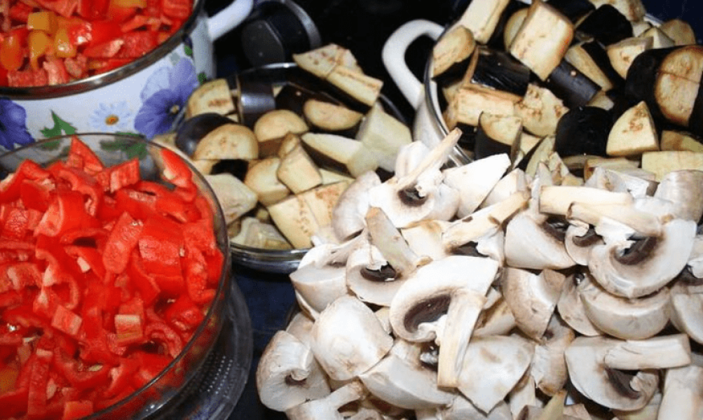 Перець, баклажани і печериці миєте і нарізаєте на шматочки (як на фото нижче).