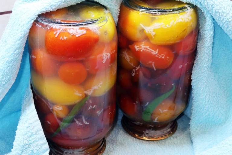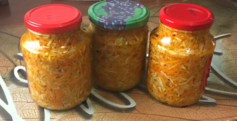 Люблю цей салат через те, що його не потрібно ні варити, ні стерилізувати. Його взагалі не потрібно консервувати. Зберігається він у скляних банках під поліетиленовими кришками.