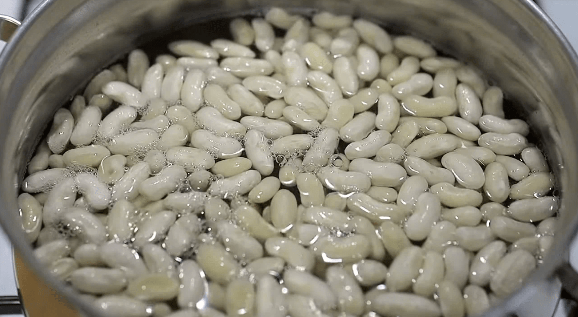 У каструлю насипаємо квасолю, наливаємо 1 літр води та ставимо на середній вогонь. Коли закипить, підливаємо ще 200 мл холодної води. Потім повторюємо те саме.