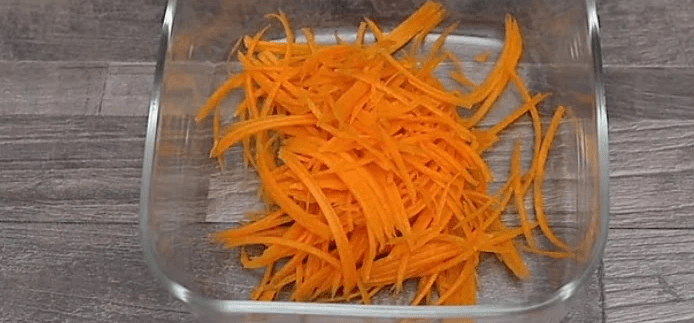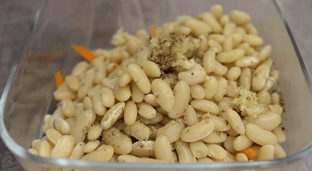 Викладаємо готову квасолю у тарілку. Моркву натираємо на тертці для корейської моркви та викладаємо до неї квасолю.