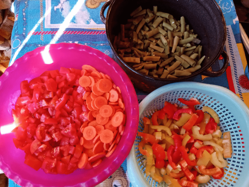 У каструлю налити олію, викласти моркву і помідори, додати сіль і цукор і варити все 30 хвилин, потім додати томатну пасту, квасолю і перці і проварити все разом.
