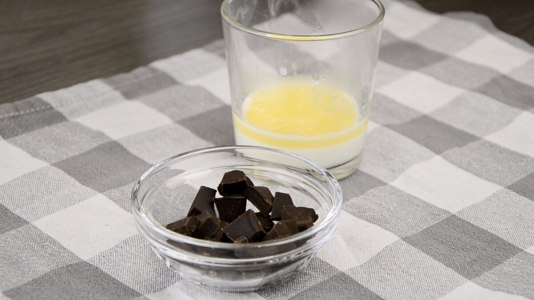 Потім додаємо до них 45 г темного шоколаду і добре перемішуємо. Спочатку може здатися, що маса розшаровується, але ви продовжуйте перемішувати в результаті вийде блискуча гладка глазур. Ну, а якщо шоколад погано тане, тоді трохи нагрійте їх і знову добре перемішайте.
