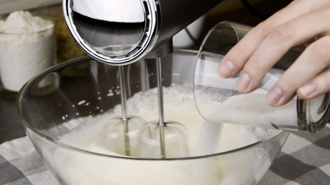 Потім поступово починаємо висипати цукор, що залишилися. І після, збільшуємо швидкість міксера до максимальної.