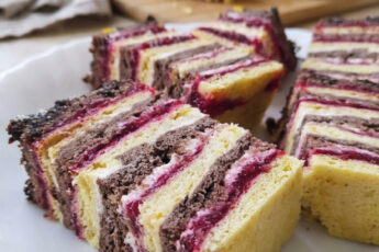 - Прикрийте другим коржем, повторіть: джем, ягоди, і 1/3 збитою сметаною.