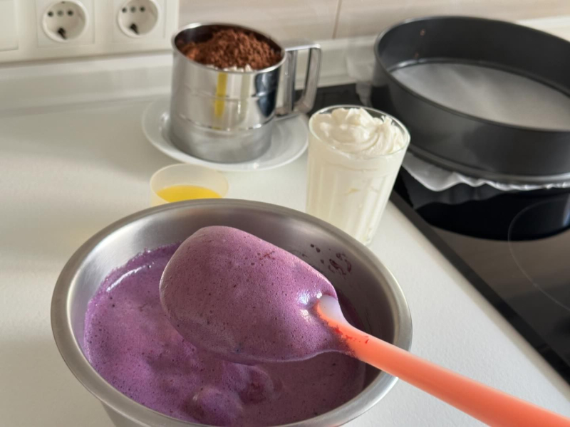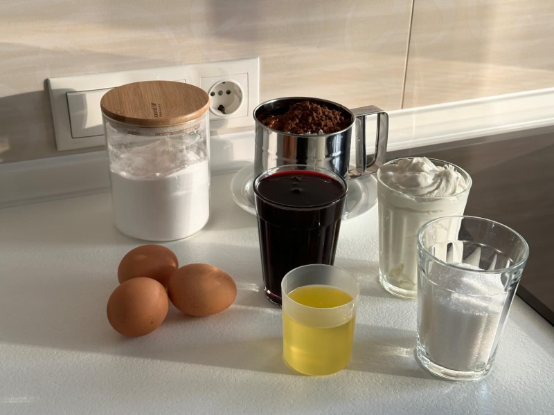 У чаші міксера збити яйця з цукром, ваніль, сіль у густу піну, далі по черзі додаєте кефір, олію, варення, борошно з какао. Перемішує всю масу на низьких оборотах міксера.