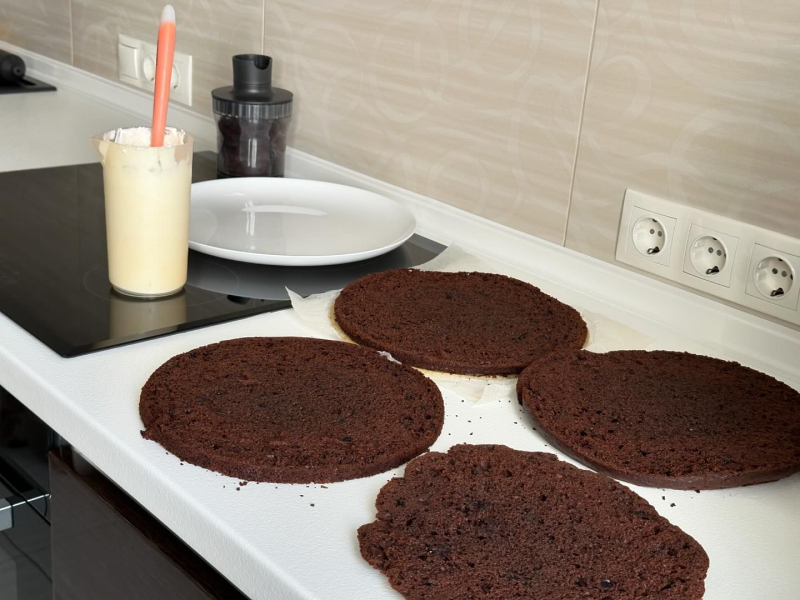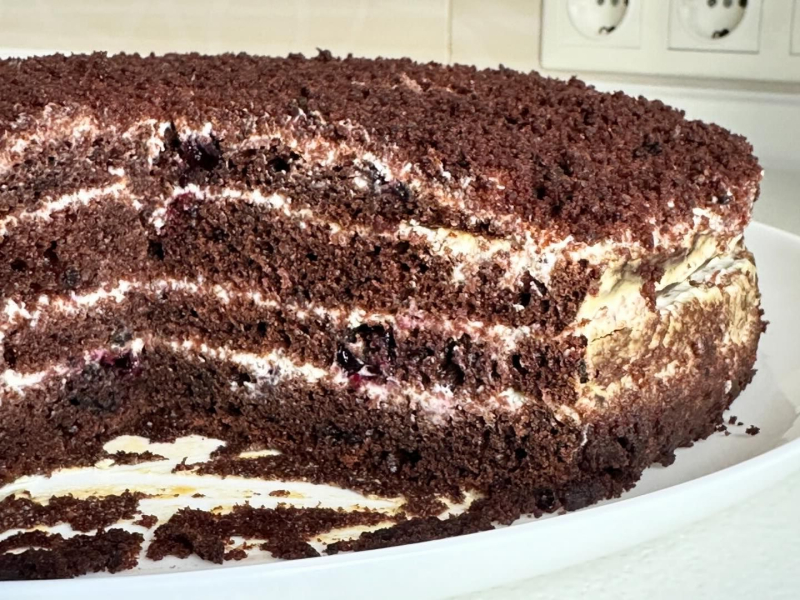 Готовий пиріг розрізаєте на 3-4 частини, перемазуєте швидким кремом зі сметани, цукру та загусника