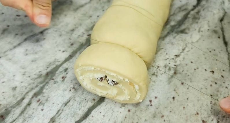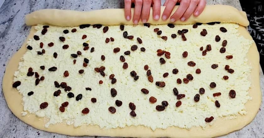 Розділіть тісто навпіл і розкачайте кожну частину в тонкий прямокутний пласт. Розподіліть сирну начинку і посипте родзинками. Скрутіть рулет, защіпніть краї і розріжте його на шматочки за допомогою нитки.