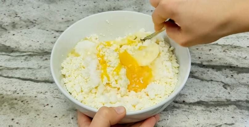 Змішайте сир з 180 г цукру, 2 ч. л. ванільного цукру, 4 яйцями, 2 білками та 60 г розм’якшеного вершкового масла. Залийте родзинки кип’ятком і залиште на 15 хвилин.
