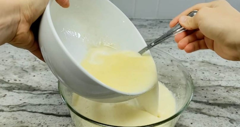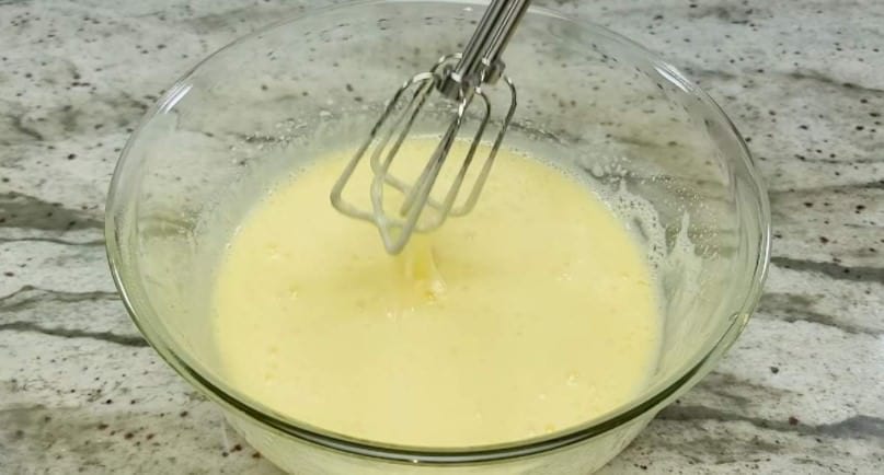 Збийте міксером 3 яйця, 120 г цукру та 0,5 ч. л. ванільного цукру. Маса має збільшитися вдвічі.