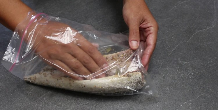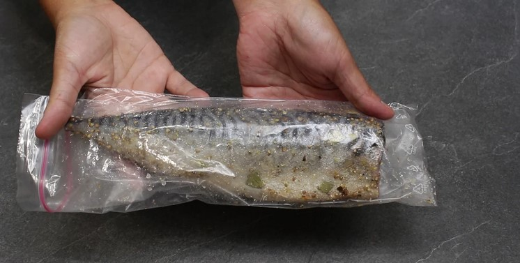 Поміщаю скумбрію в пакет і добре натираю рибу з усіх боків та всередині.