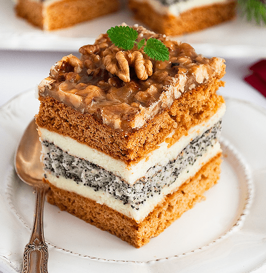Лускунчик з маком — це медовий корж з пудинговим кремом всередині, маковим коржом і карамельно-горіховим шаром. Неймовірно смачний торт, який тане в роті.