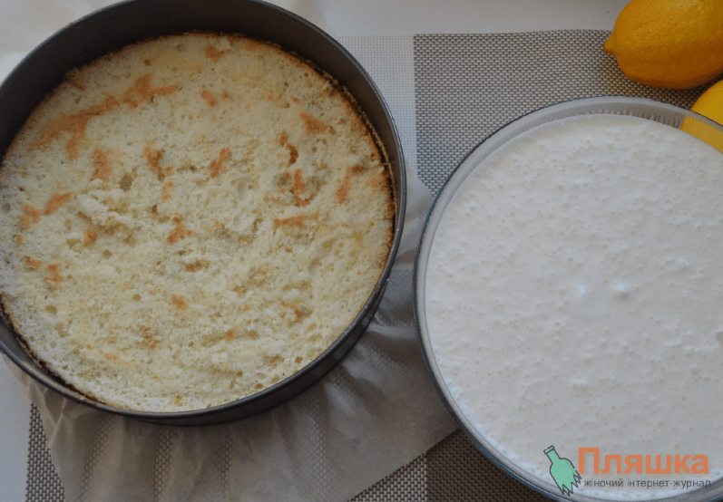 Верхню частину коржа я трохи зрізаю, збризкую лимонним соком.
