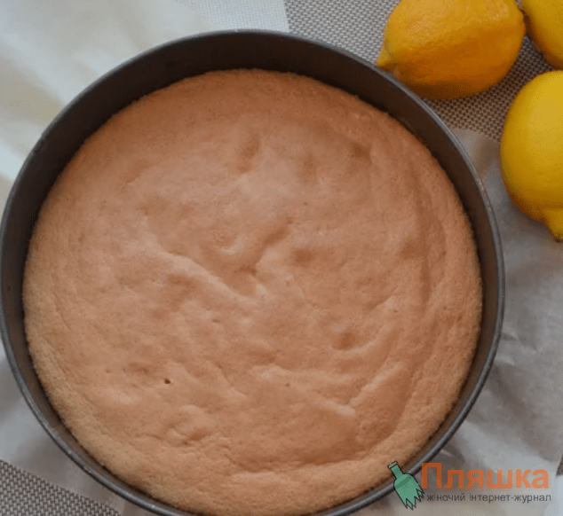Перевіряємо готовність за допомогою зубочистки, дістаємо наш бісквіт із духовки. Відставляємо у бік для остигання та приступаємо до приготування суфле.