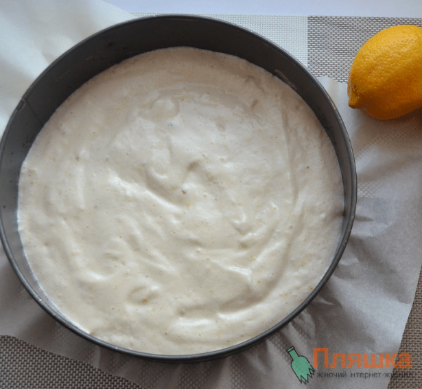 Викладаємо в роз’ємну форму (у мене форма діаметром 22 см), дно форми встеляємо пергаментним папером, розрівнюємо і відразу ставимо в духовку.