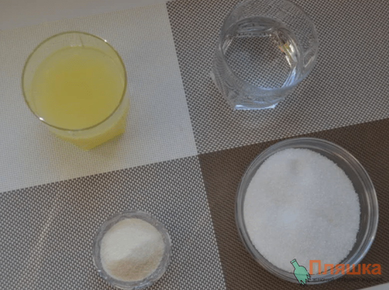 Желе. Желатин замочуємо у лимонному соку. Як тільки він набухне, змішуємо всі інгредієнти ( воду і цукор), ставимо на вогонь, нагріваємо до розчинення цукру.