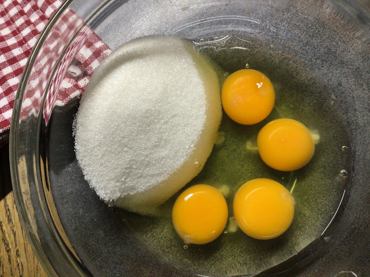 У миску розбиваємо яйця і змішуємо їх з цукром. Краще це зробити за допомогою вінчика. Збиваємо все до пишної, світлої піни.