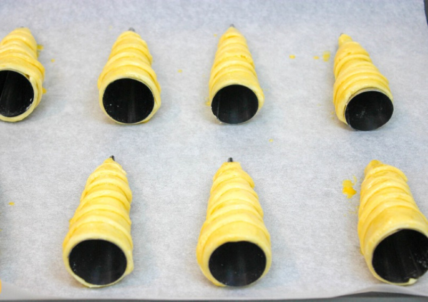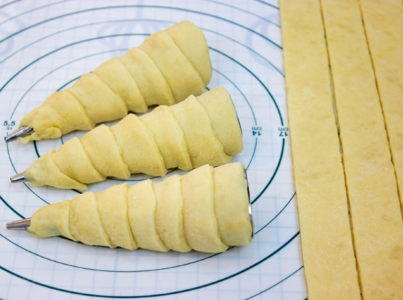 Кожну смужку тіста потрібно накрутити на металевий конус, починаючи від широкого краю, обмотуючи по спіралі з невеликим нахльостом. Якщо у вас немає металевих конусів, можна їх зробити самостійно, тільки заздалегідь, з пергаментного паперу та фольги. Скласти квадратний лист пергаменту в трикутник, а потім скрутити в кульок, обрізати зайве та закріпити край, зверху обернути фольгою.
