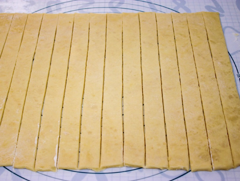 Робочу поверхню присипати борошном. Тісто розкотити в прямокутний пласт, товщиною близько 3 мм. Краї обрізати, потім нарізати смужки завширшки 2,5 см.