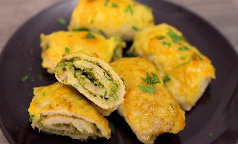 - Викладаємо фаршировані курячі грудки, рясно поливаємо соусом, що залишився і відправляємо в розігріту до 190 градусів духовку приблизно на одну годину.