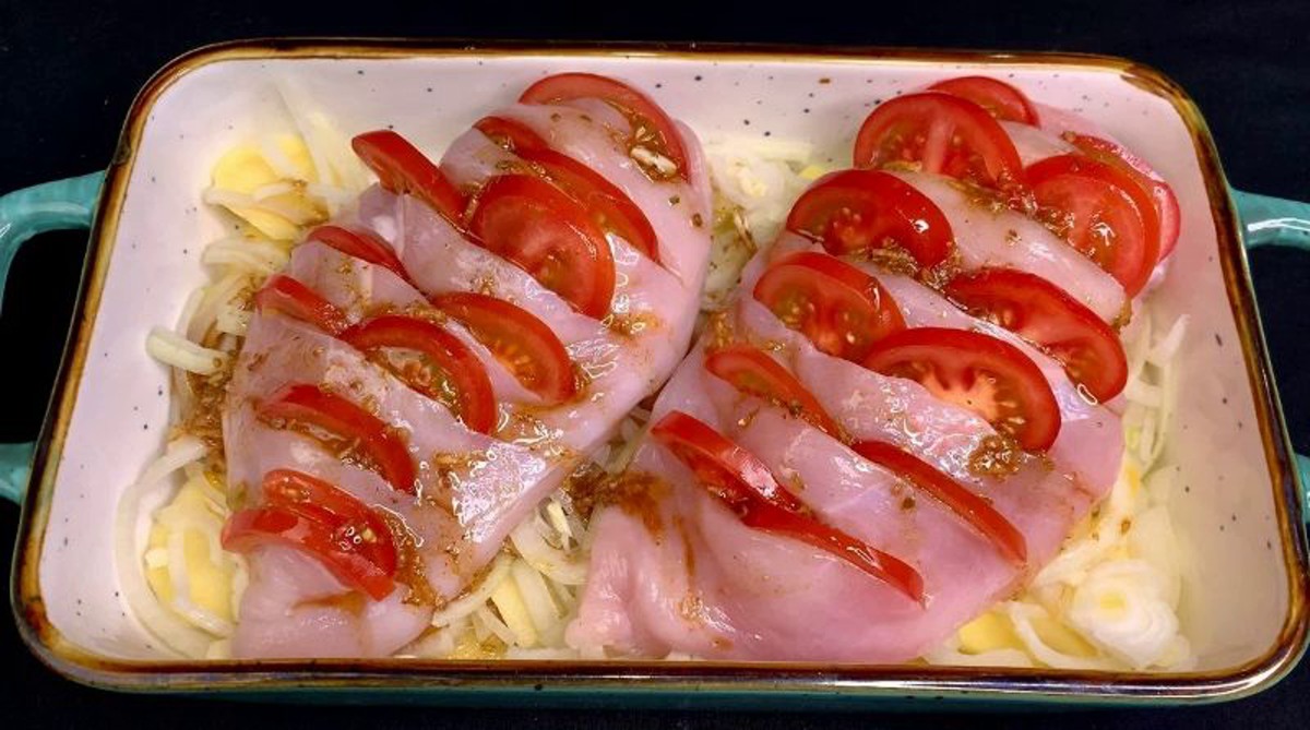 Соус-маринад у процесі запікання просочує і курку і картоплю, надаючи страві яскравого насиченого аромату та смаку. Коли дістаєш форму з духовки, хочеться якнайшвидше почати пробувати! Рум’яна запечена картопля, соковита курка з помідорами і підпечена цибулька – смачно! Рекомендую приготувати, спробувати та переконатися, наскільки гарний цей рецепт!