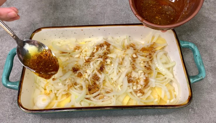 - На картоплю викладаємо гарний шар цибулі великими кільцями, пару зубчиків дрібно нарізаного часнику і зверху поливаємо половиною приготованого раніше соусу.