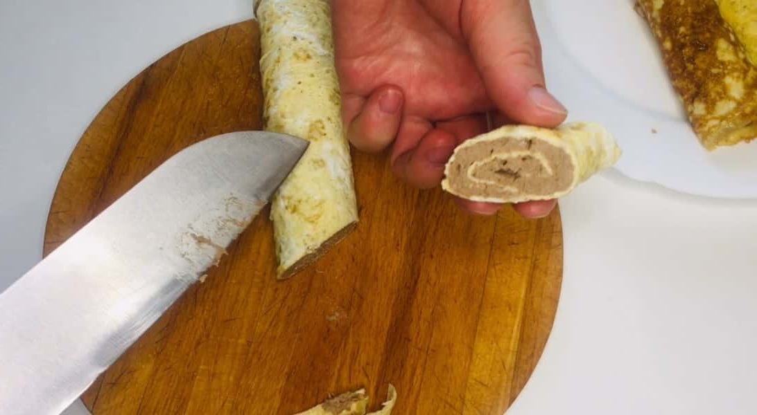 Приготовленим паштетом змащуємо млинці і ставимо в холодне місце, щоб повністю охолонули. Паштет застигне і закуска добре нарізатиметься.