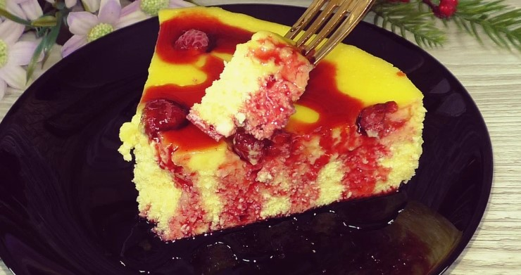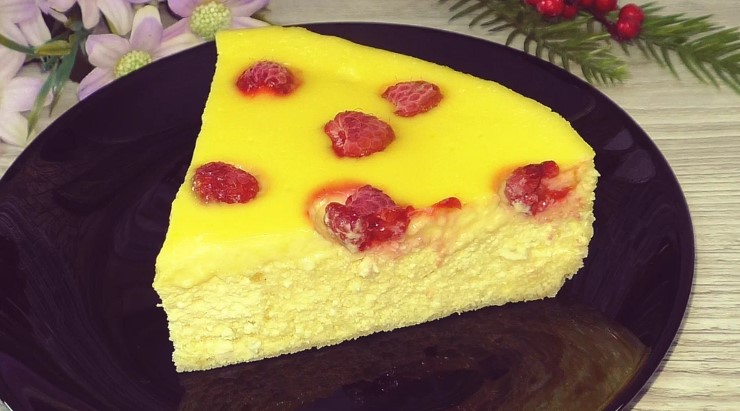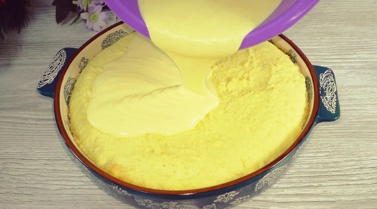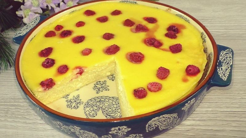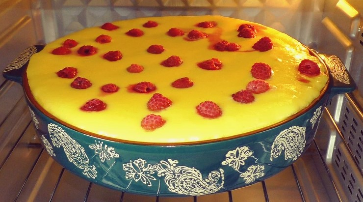 Виймаємо запіканку з духовки, вона вже готова, виливаємо крем на гарячу заготовку, зверху ягоди (за бажанням). У мене з морозильної камери попередньо не розморожувала.