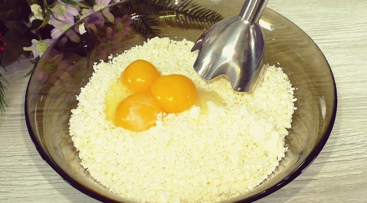 У миску до сиру відправляю дрібку солі, ванільний цукор та жовтки. Розтоплене вершкове масло. За бажанням все подрібнити занурювальним блендером.