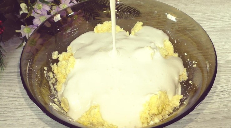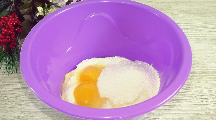 Готуємо сметанну заливку: змішуємо сметану, цукор, яйця, перемішуємо.